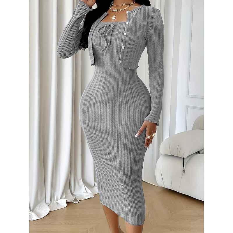 Women's Dress Set Sheath Dress Elegant Plain Buttons Midi Dress Long Sleeve Crew Neck Outdoor Vacation Blue Green Gray Spring Fall Regular Fit