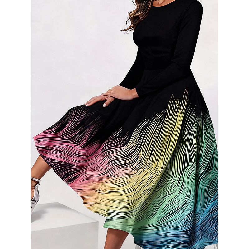 Women's Midi Dress Casual Dress Swing Dress Elegant Fashion Outdoor Daily Weekend Regular Fit Ombre Striped Long Sleeve Crew Neck Black White Spring Fall Winter Autumn