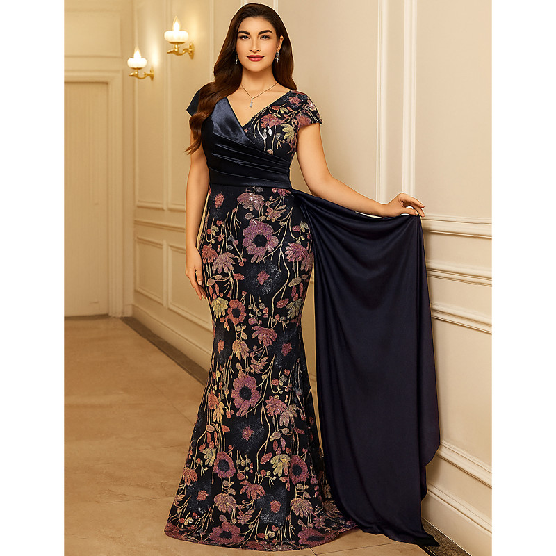 A-Line Floor Length Beaded Eembroidered Wedding Guest Dress Formal Dresses Mother of the Bride Dress Short Sleeve V Neck Elegant Vintage Party Formal Evening Wedding Party with Beading Color Block