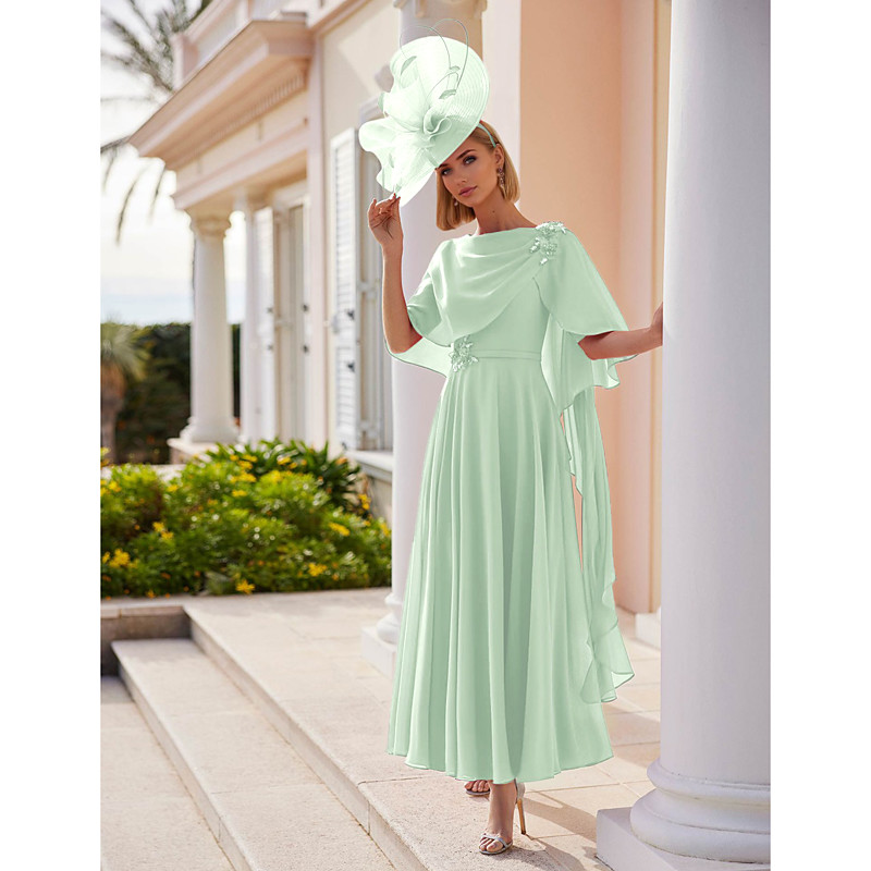 A-Line Dress Ankle Length Party Dress Cocktail Dress Wedding Guest Dress Mother of the Bride Dress Short Sleeve Bateau Neck Elegant Formal Stretch Chiffon with Lace Tier Solid Color