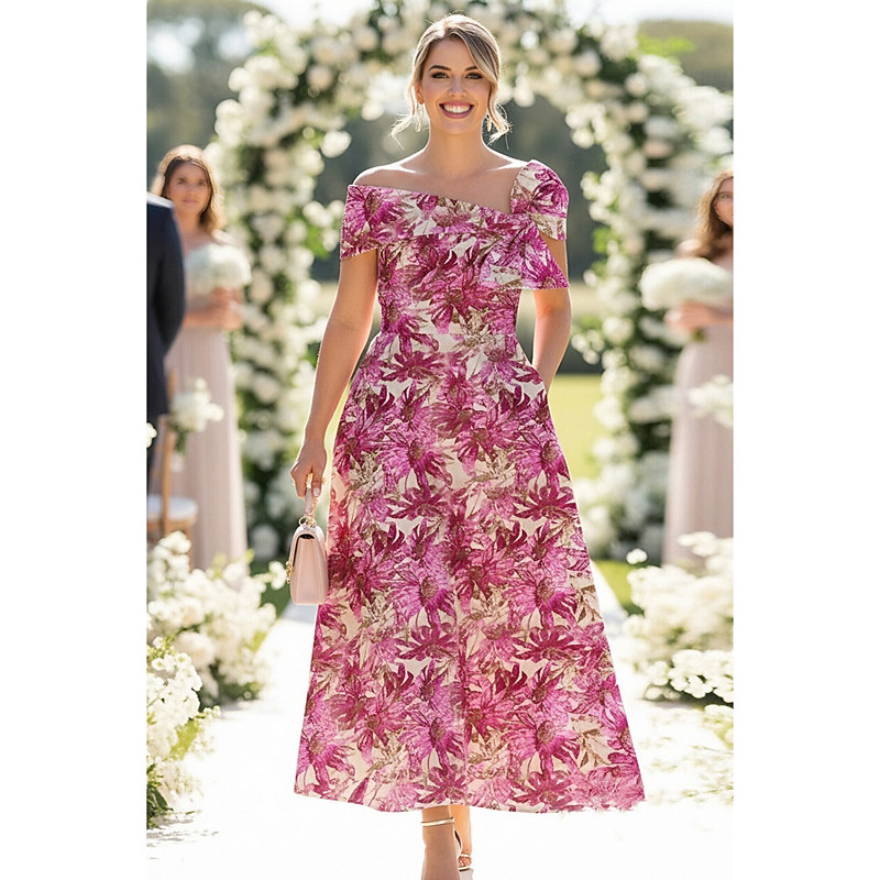 A-Line Ankle Length Beaded Eembroidered Formal Dresses Mother of the Bride Dress Cocktail Dresses Party Dresses Elegant Vintage Short Sleeve Off Shoulder Wedding Formal Satin with Floral Print Pocket