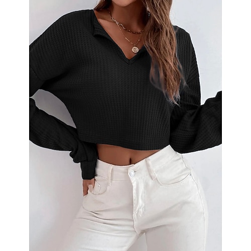 Per donna Maglietta Top a maglia waffle Tinta unica Moda Caldo Sexy Manica Lunga Scollo a V Colletto a Camicia Top corti Quotidiano Uscire Weekend Nero Blu Reale Grigio Primavera Autunno