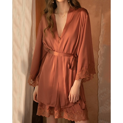 Per donna Accappatoio Camicia da Notte Set Pigiama Casual Morbido Raso Colore Puro Pizzo Vestiti Quotidiano Casa Da letto Manica Lunga Spalline Nero Bianco Rosa Vino Marrone Estate Vestibilit