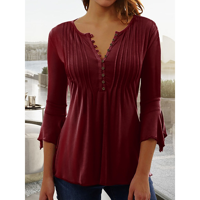 Women's Blouse Solid Color Plain Elegant Bohemia Stylish 3/4 Length Sleeve Ruffle Sleeve V Neck Regular Tops Work Daily Holiday Ruched Ruffle Buttons Black White Wine Red Summer Spring Fall