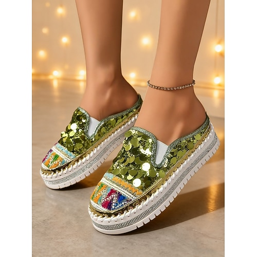 Sneakers da donna con plateau e paillettes - scarpe da festa slip-on glitterate con ricami colorati per outfit da sera, club e festival