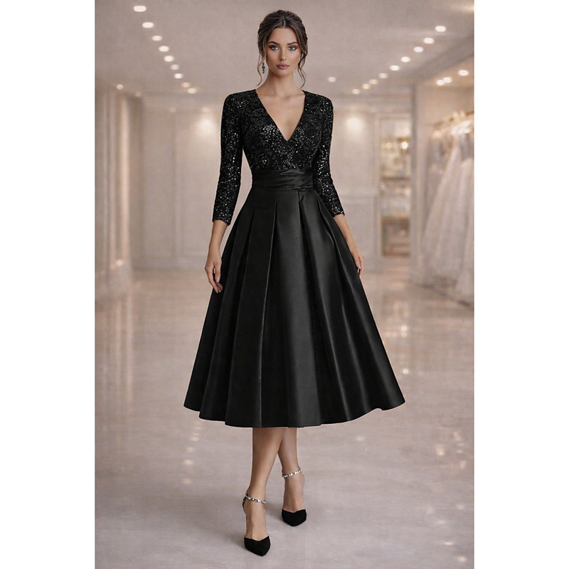 A-Line Tea Length Beaded Eembroidered Formal Dresses Mother of the Bride Dress Cocktail Dresses Party Dresses Elegant Sparkle 3/4 Length Sleeve V Neck Christmas Wedding Guest Satin Velvet with Pleats