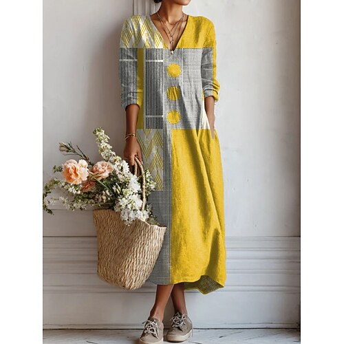 Per donna Abito Midi Vestito Estivo Abito a Tubino Casual Feste Ferie Vestibilità comoda Geometrico Manica Lunga Scollo a V Giallo Rosa Marrone chiaro Estate Primavera