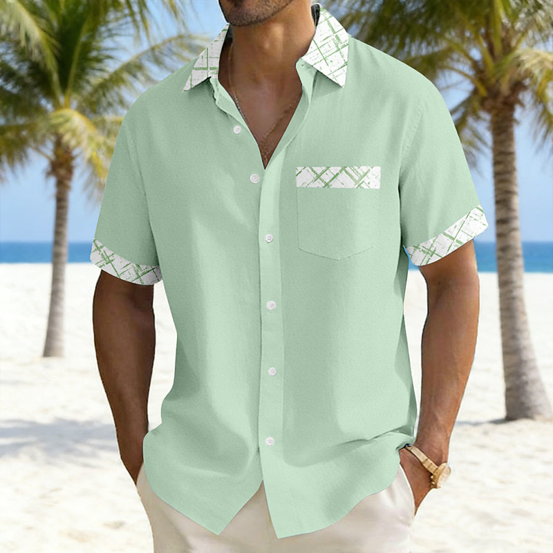 Men's Geometric Grid / Plaid Patterns Shirt Summer Shirt Button Up Shirt Short Sleeve Fashion Casual Streetwear Vacation Holiday Summer Turndown 3D Print Front One Pocket Linen Like Shirt Blue White