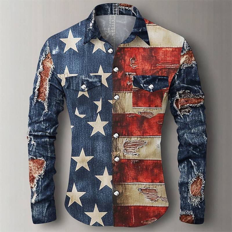 Men's National Flag Shirt Button Down Shirt Casual Shirt Long Sleeve Casual Comfortable Vacation Street Holiday Spring Fall Lapel Pocket Print Blue Black