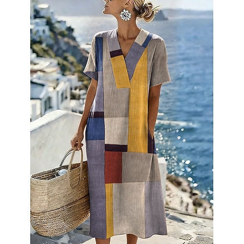 Per donna Abito Midi Vestito Estivo Vestito Casual Vacanza Casual Spiaggia Spiaggia Feste Vestibilità comoda Grafico Geometrico Manica Corta Scollo a V Rosa Viola Arancione Estate Primavera