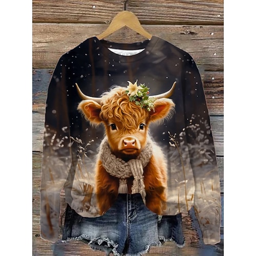 Per donna Felpa Pullover Grafico Animale Mucca Moda Casual Manica Lunga Girocollo Top Regolari Streetwear Abbigliamento Quotidiano Casuale Stampato Marrone rossastro Nero Bianco Marrone Cachi Autunno