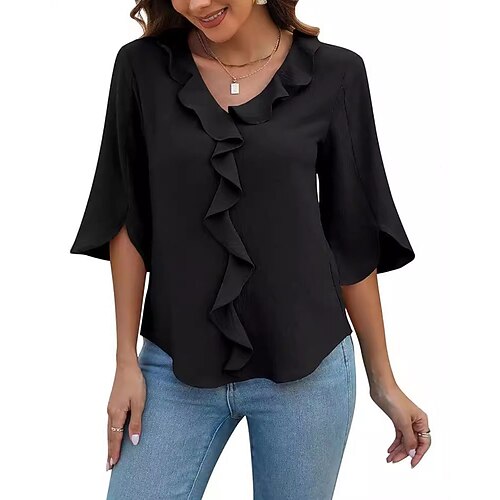 Per donna Blusa Semplice Elegante Manica Lunga Scollo a V Top Regolari Ferie Uscire Volant Nero Rosa Blu marino Azzurro cielo Estate Primavera Autunno