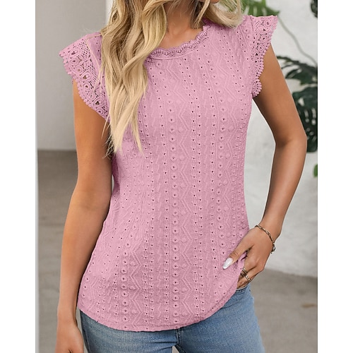 Per donna Maglietta Tinta unica Casual Manica Corta Girocollo Top Regolari Quotidiano Uscire Weekend Pizzo Traforato Blu Nero Bianco Rosa Azzurro cielo Estate