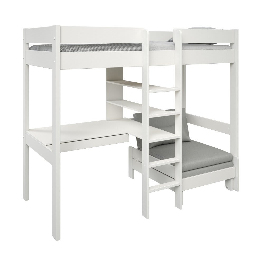 Letto a soppalco in pino bianco con scrivania e poltrona 90x200