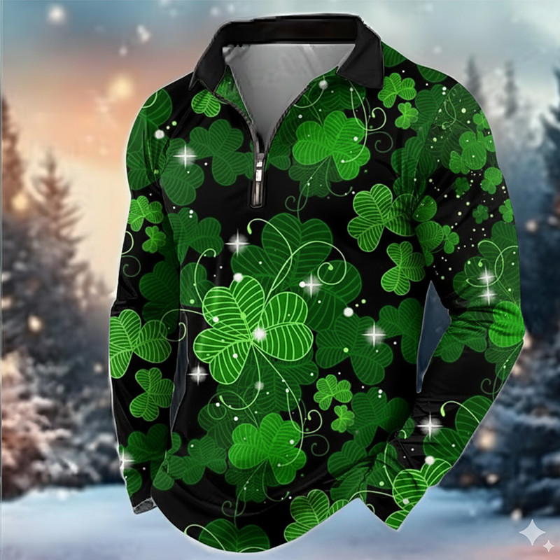 St. Patrick Men's Shamrock Polo Long Sleeve Turndown Modern Leisure Athleisure Casual Daily Festival Zipper 3D Print Spring Fall Winter Green Light Green