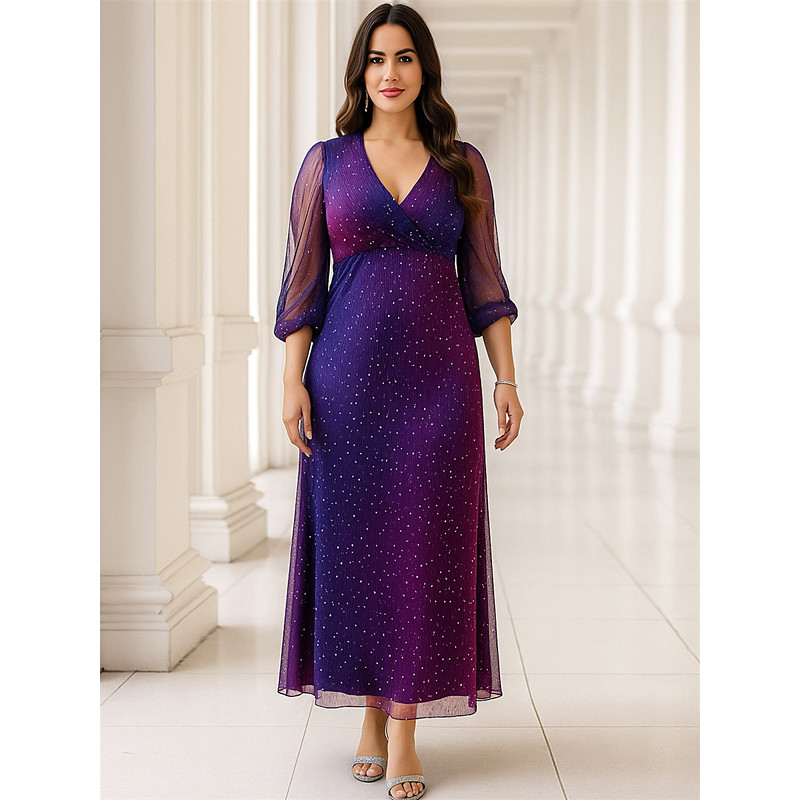 A-Line Ankle Length Party Dress Cocktail Dress Wedding Guest Dress Mother of the Bride Dress 3/4 Length Sleeve V Neck Plus Size Sparkle Shine with Solid Color