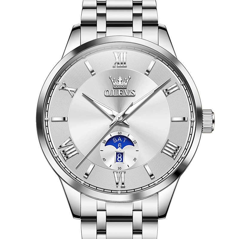 OLEVS Men Quartz Watch Fashion Casual Wristwatch Moon phase Luminous Calendar Chronograph Leather Strap Watch