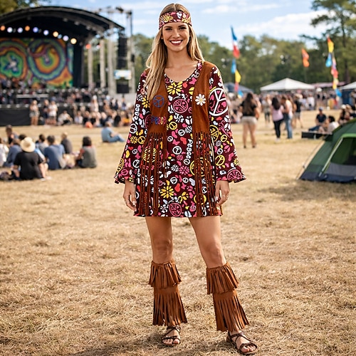 Set Retrò Vintage Anni '70 Vestito Copricapo Accessori Lunghe Hippie Disco Frange Floreale Costume Per donna Halloween Carnevale Festival Musicale Festa a tema retrò Adulti Vestito Copricapo Altri