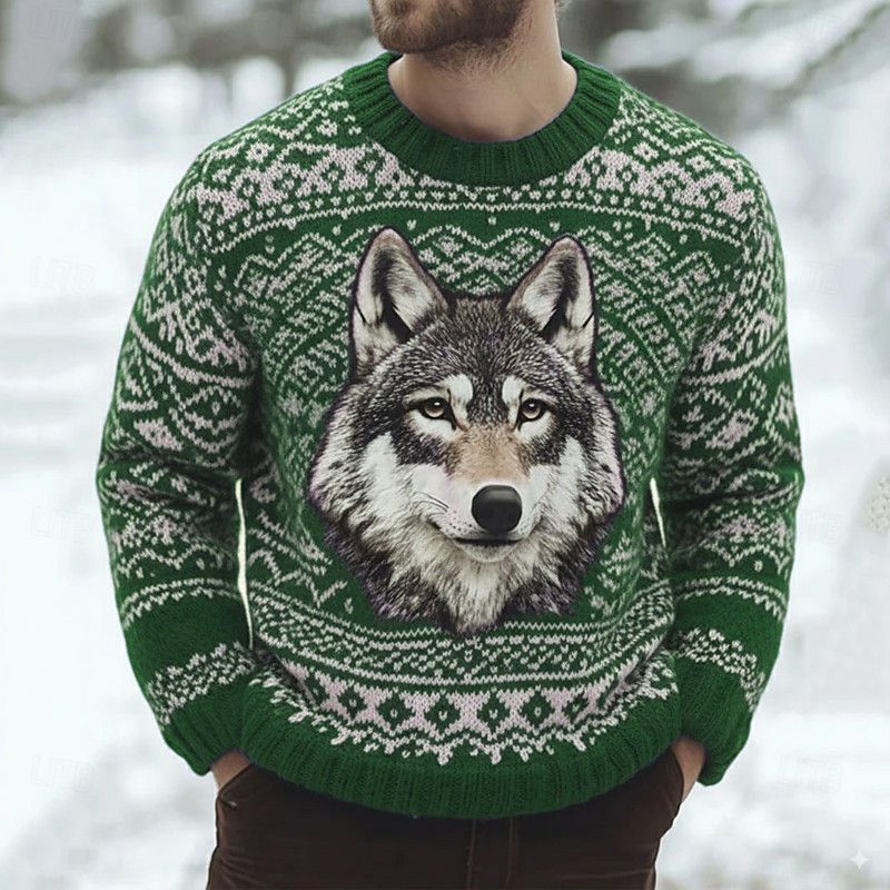 Men's Wolf Fair isle Sweater Pullover Sweater Jumper Knitwear Crewneck Casual Vacation Daily 3D Print Keep Warm Long Sleeve Spring Fall Winter Blue Purple Brown