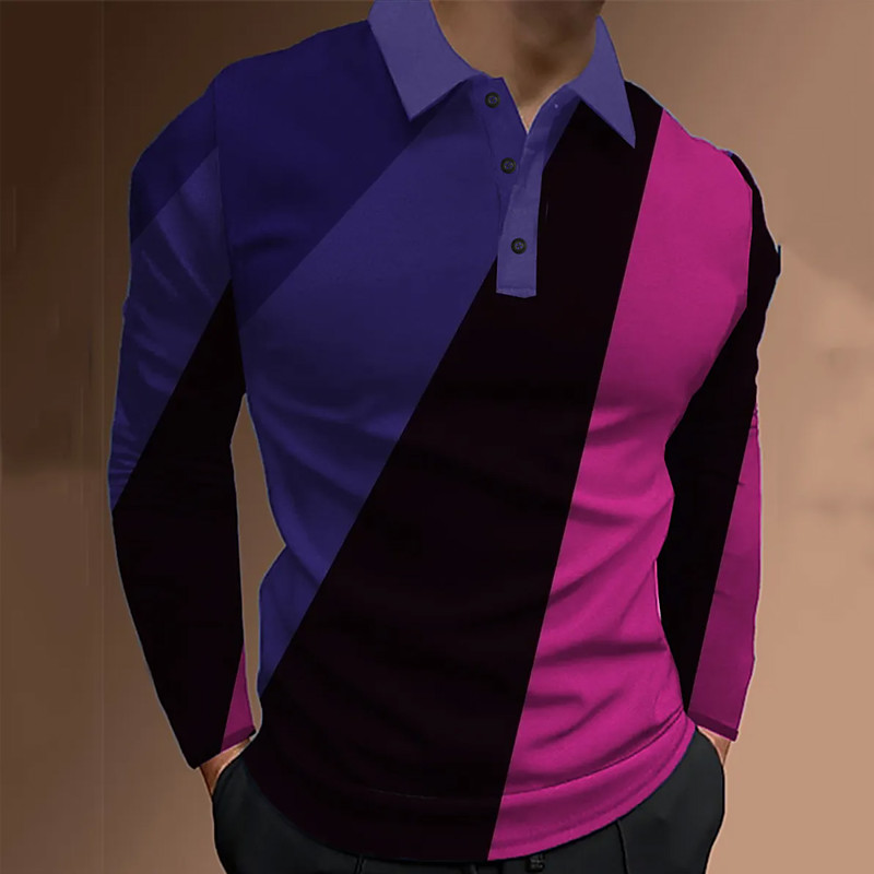 Men's Abstract Geometic Polo Long Sleeve Polo Shirts Lapel Casual Outdoor Street Athleisure Daily Wear 3D Print Buttons Spring Fall Winter Blue 1 Blue Purple