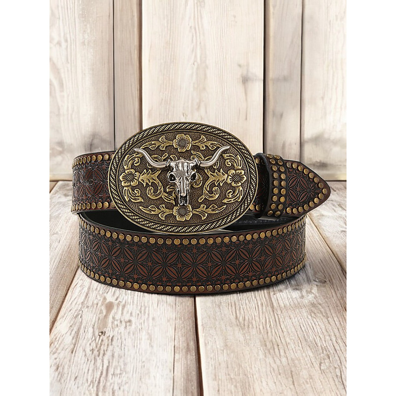 Men's Western Faux Leather Belt with Engraved Floral Design and Bull Skull Buckle – Vintage-Style Cowboy Belt for Rodeo and Casual Wear