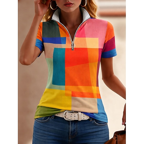 Per donna Maglietta Cerniera Zip a un quarto Grafico Geometrico Blocco di colori Tropicale Hawaiano Elegante Manica Corta Collo Alto Top Regolari Matrimonio in Spiaggia Quotidiano Sportivo Blu Rosa