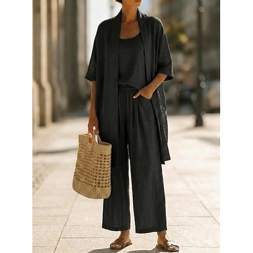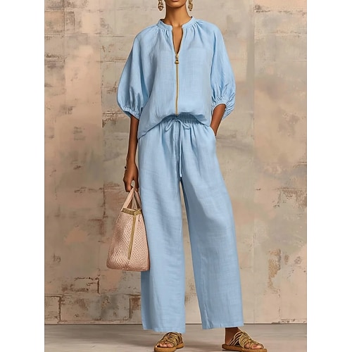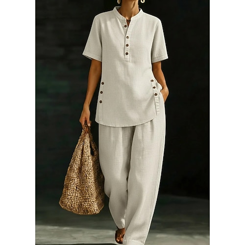 Per donna Set di Pantaloni Finto cotone e lino Manica Corta Girocollo Tinta unica Moda Streetwear Casuale Quotidiano All'aperto Blu Nero Bianco Primavera Estate Vestibilità comoda