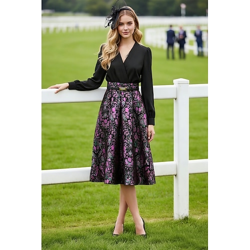 Abito a lunghezza tè A-Line Abito da festa Abito da cocktail Abito per matrimonio Abito per madre della sposa Maniche lunghe Collo a V Elegante Vintage Festa con fiori