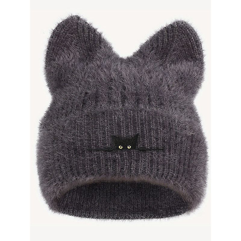 Women's Fuzzy Knit Cat Ear Beanie Hat, Cute Winter Warm Cap with Black Cat Embroidery, Stylish Christmas Gift for Girls Women
