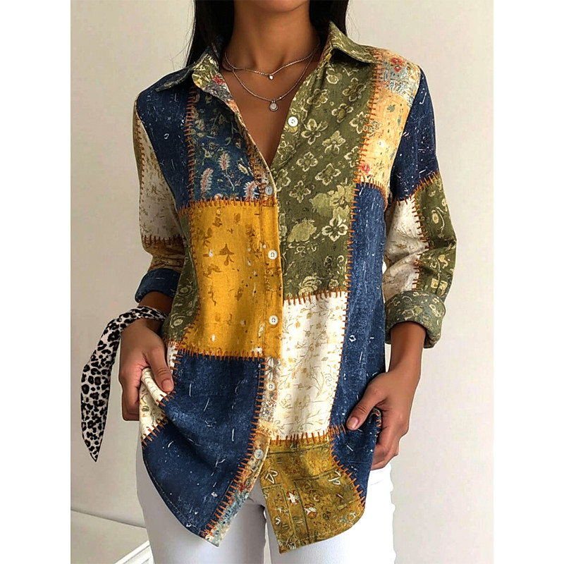 Women's Shirt Floral Color Block Elegant Bohemia Vintage Long Sleeve Shirt Collar Regular Tops Work Daily Holiday Patchwork Buttons Print Green Summer Spring Fall