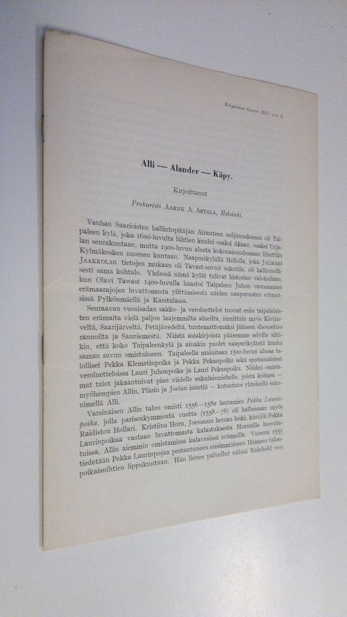 Aarne A Astala : Alli-Alander-Käpy (eripainos Genos 1976 n:o 4)