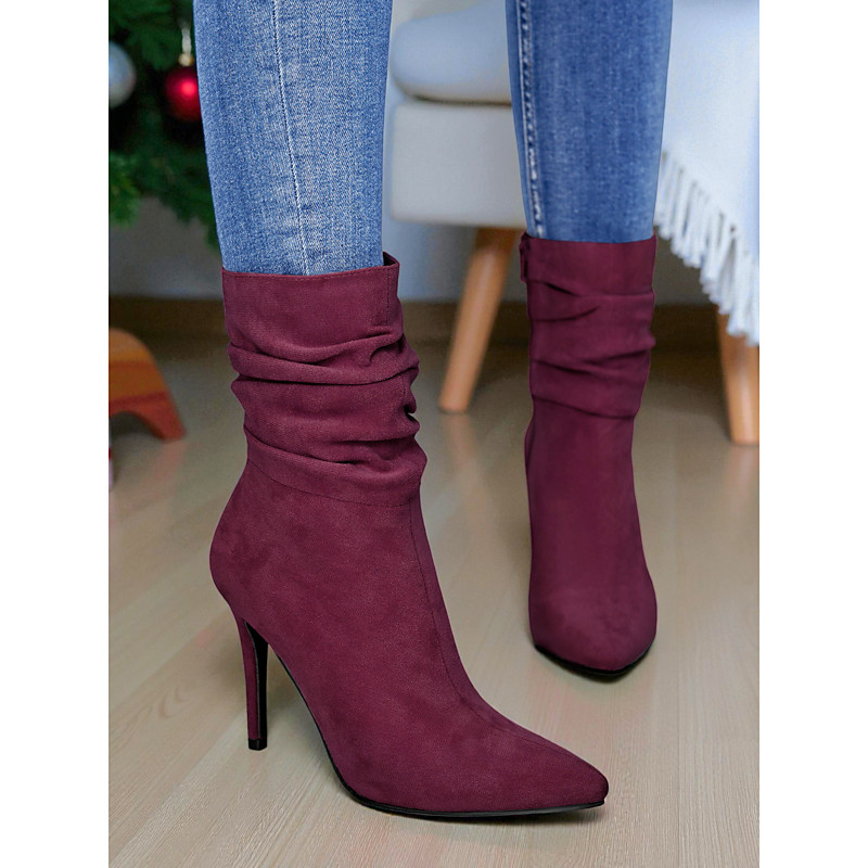 Women's Burgundy Suede Slouchy Boots - Stylish Pointed Toe, High Heel Fashion Boots with Ruched Design for Daily and Party Wear, Perfect for Fall and Winter