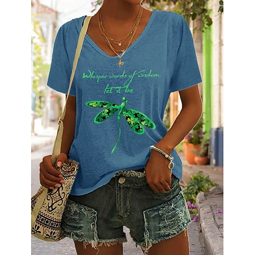 St. Patrick's Day Damen-T-Shirt mit Kleeblatt- und Libellenmotiv im Vintage-Stil, klassisch, Kurzarm, V-Ausschnitt, normale Passform, für jeden Tag, in Blau, Schwarz, Grün und Grau, für Sommer und