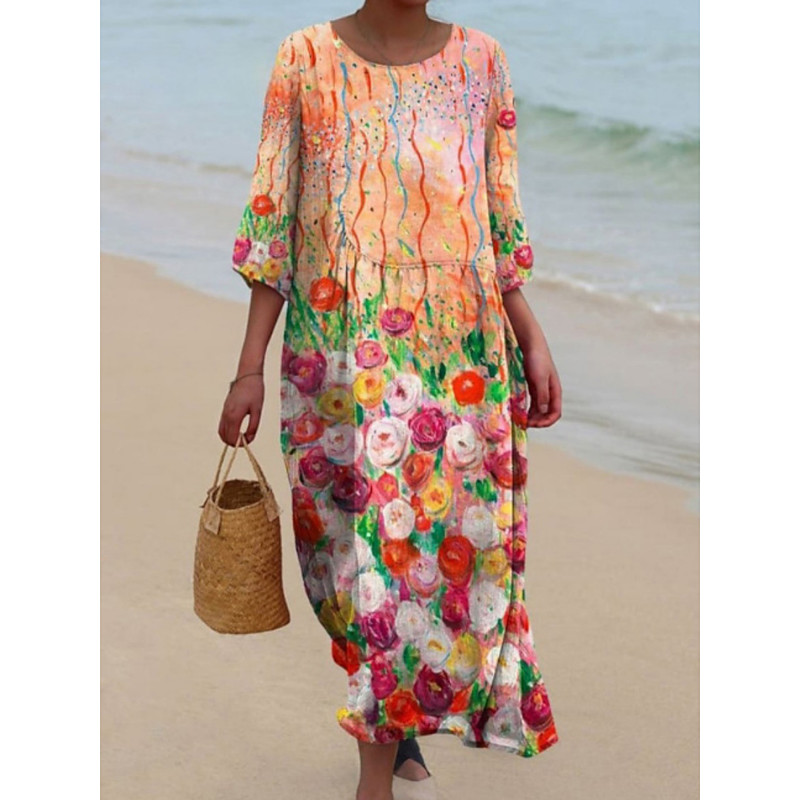 Women's Midi Dress Casual Dress Print Dress Vintage African Daily Beach Weekend Regular Fit Floral Color Block 3/4 Length Sleeve Crew Neck Yellow Pink Red Spring Fall Autumn