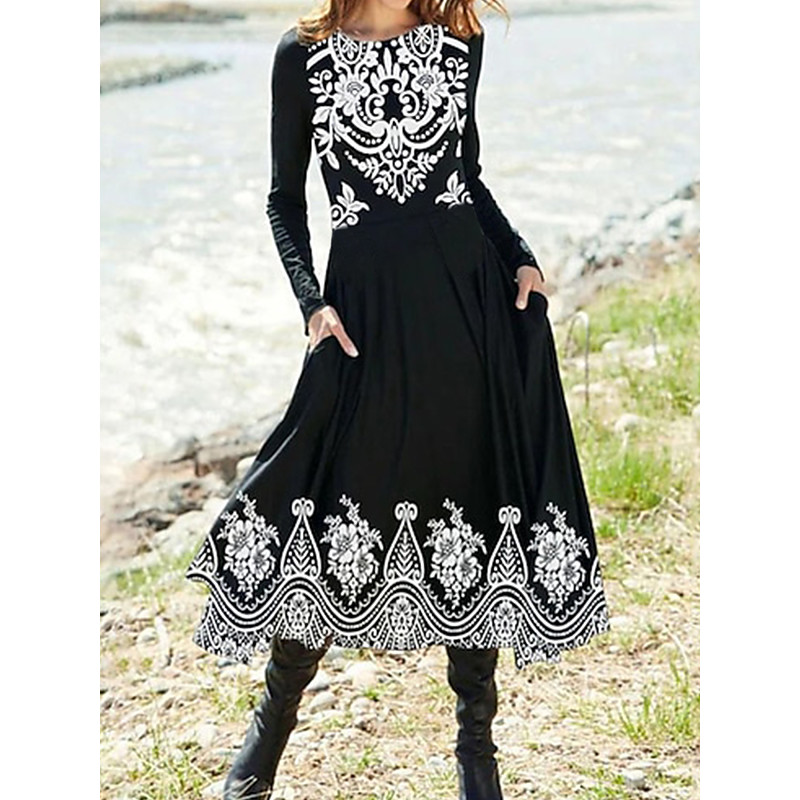 Women's Midi Dress A Line Dress Fit And Flare Dress Vacation Casual Daily Regular Fit Graphic Geometric Long Sleeve Crew Neck Black White Red Blue Summer Spring Fall Winter