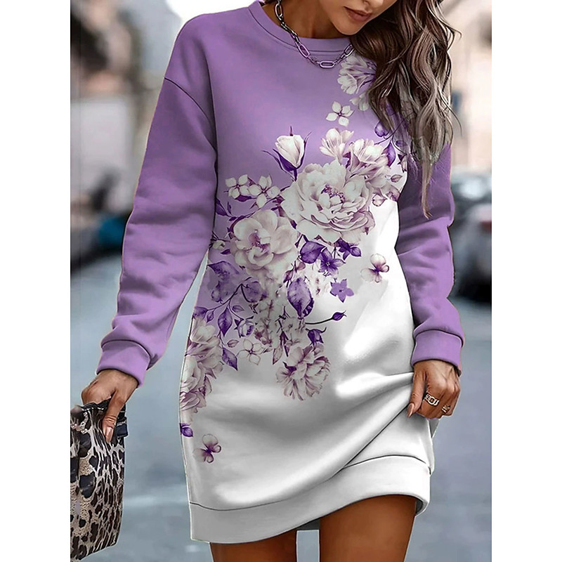 Women's Mini Dress Shift Dress Casual Holiday Going out Weekend Regular Fit Floral Graphic Long Sleeve Crew Neck Pink Purple Green Gray Spring Fall Winter