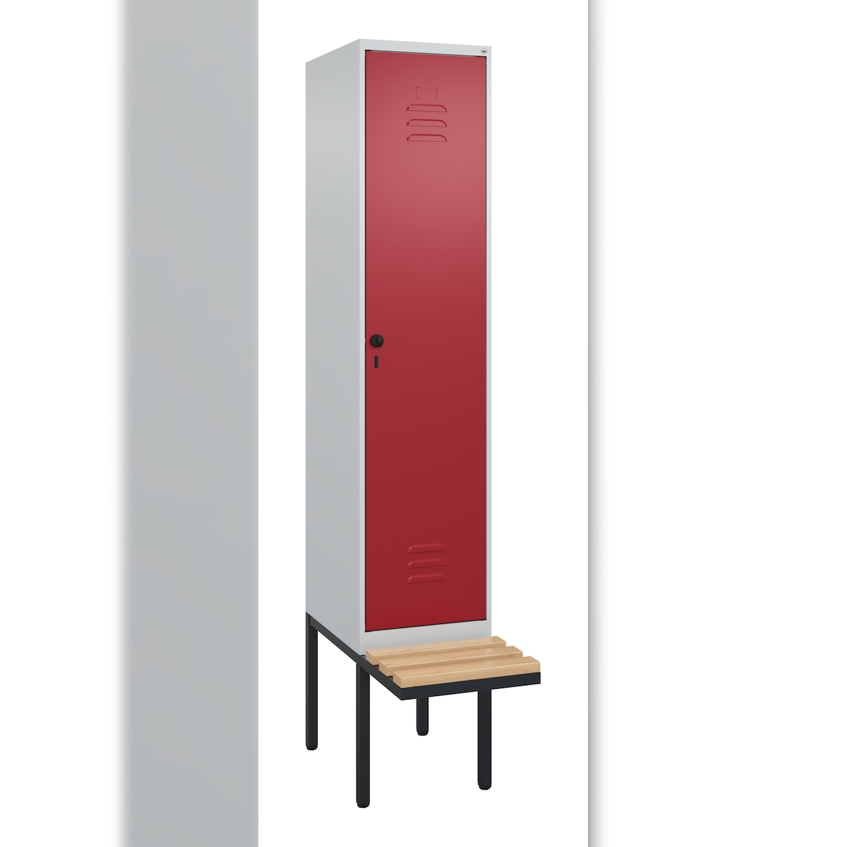 C+P Spind Classic PLUS, schwebender Sitzbank aus Buche 1 Abteil, HxBxT 212x40x82cm, Sicherheitsdrehriegel, Hellgrau/Rubinrot von PROREGAL
