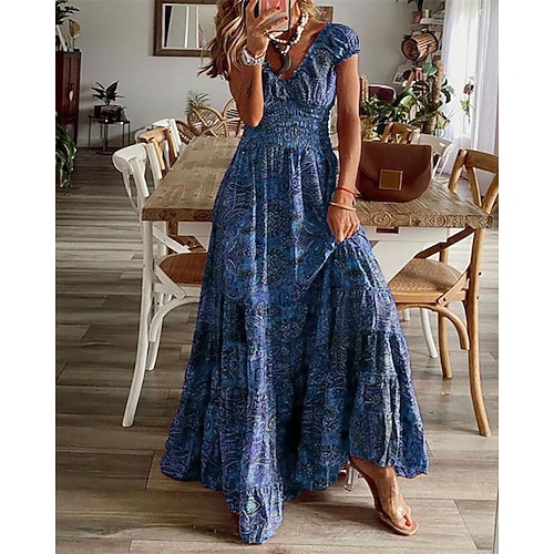 Per donna Abito Lungo Maxi Abito Vestito Casual Abito Stampato Elegante Moda Moderno Quotidiano All'aperto Vacanza Vestibilità regolare Floreale Grafico Manica Corta Scollo a V Blu Vino Viola Marrone