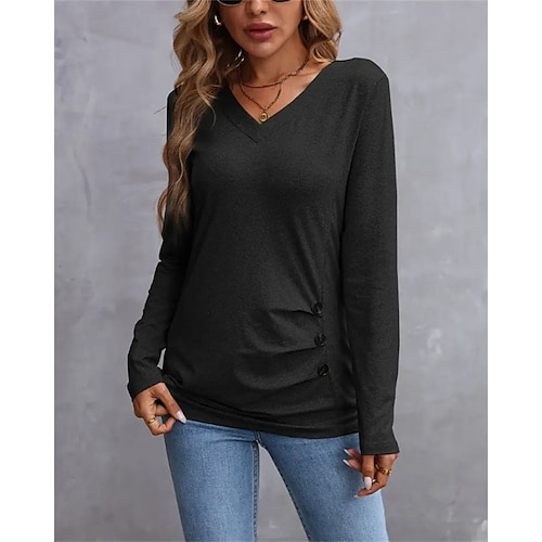 Per donna Maglietta Tinta unica Semplice Elegante Vintage Moda Manica Lunga Scollo a V Top Regolari Quotidiano Uscire Weekend Patchwork Bottoni Nero Bianco Vino Grigio chiaro Primavera Autunno
