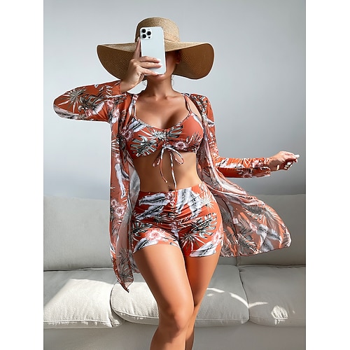 Damen Bikini 3-Teilig Badeanzug Palm Boy Leg Slim Rückenfrei Urlaubs Strandbekleidung Floral Halterneck Ärmellos Lange Ärmeln Bademode