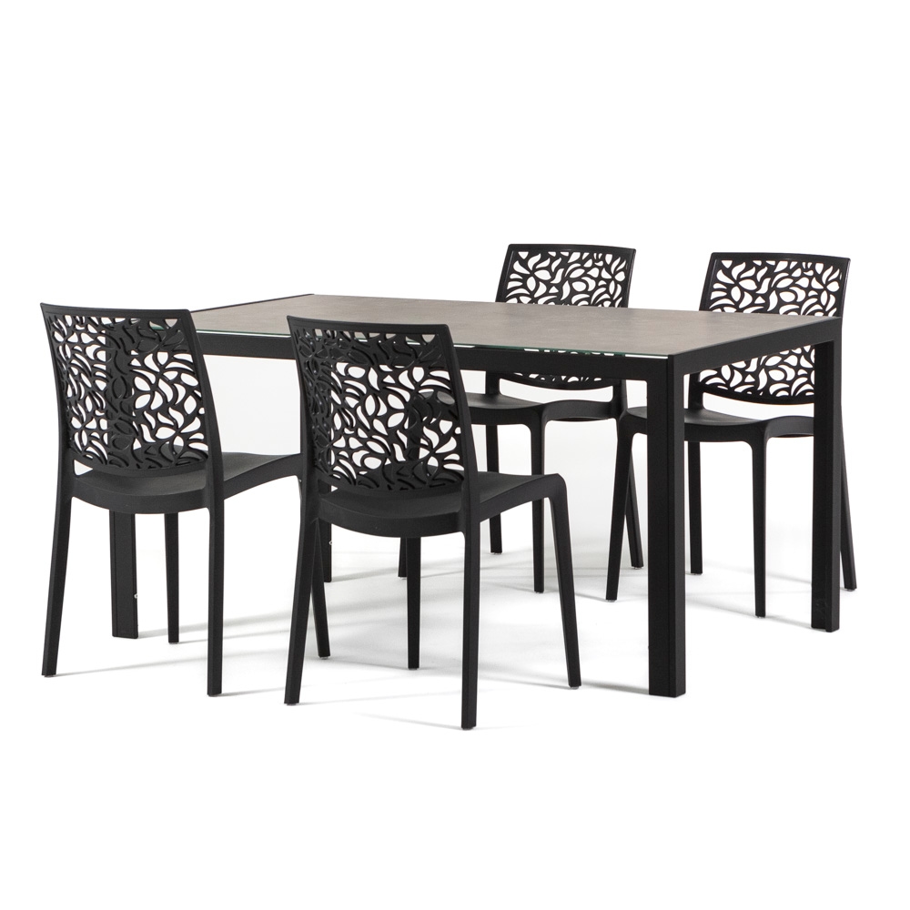 RATTATAN Esszimmer- und Gartenset mit Aluminiumtisch und 4 stapelbaren Stühlen aus Polypropylen, ideal für Küche oder Garten – MILO+ANNA–Schwarz/Schwarz/Granit