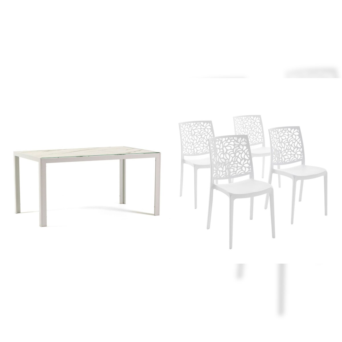 RATTATAN Esszimmer- und Gartenset mit Aluminiumtisch und 4 stapelbaren Stühlen aus Polypropylen, ideal für Küche oder Garten – MILO+ANNA – Weiß/Weiß/Marmor