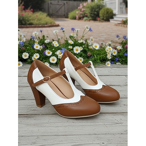 scarpe con tacco a T da donna in stile retrò anni '50, marroni e bianche, con dettagli brogue e chiusura con fibbia: scarpe mary jane vintage per ufficio, feste in giardino ed eventi a tema retrò