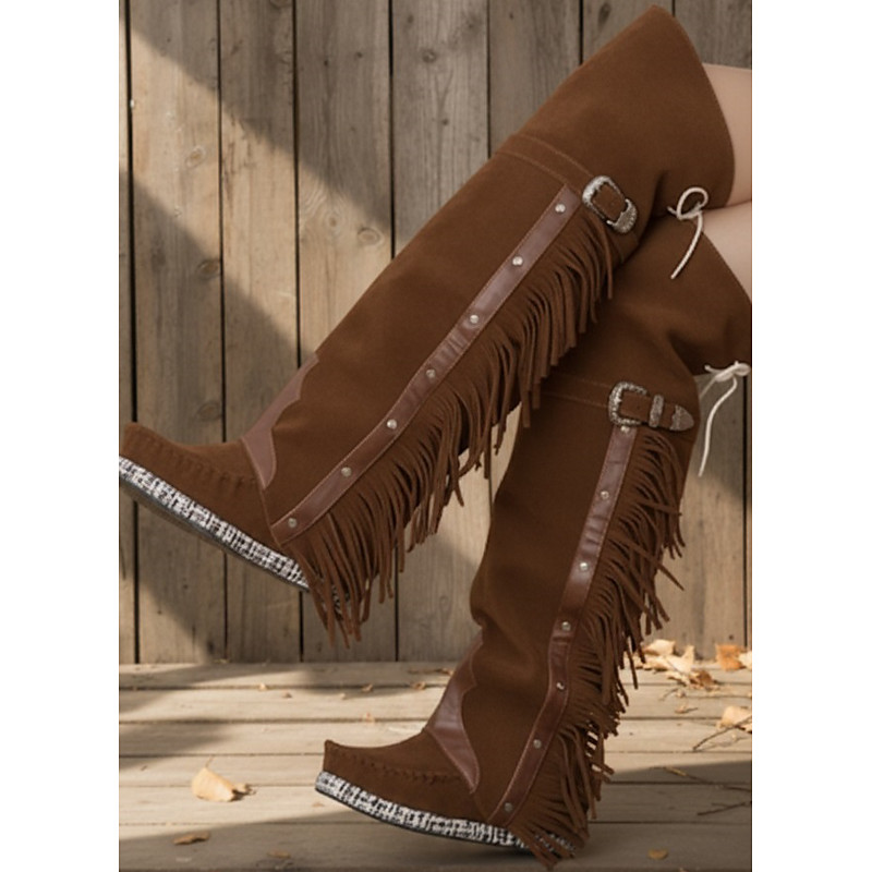 Women's Fringe Over The Knee Boots - Tan Suede Western Boho Style Boots for Autumn Winter