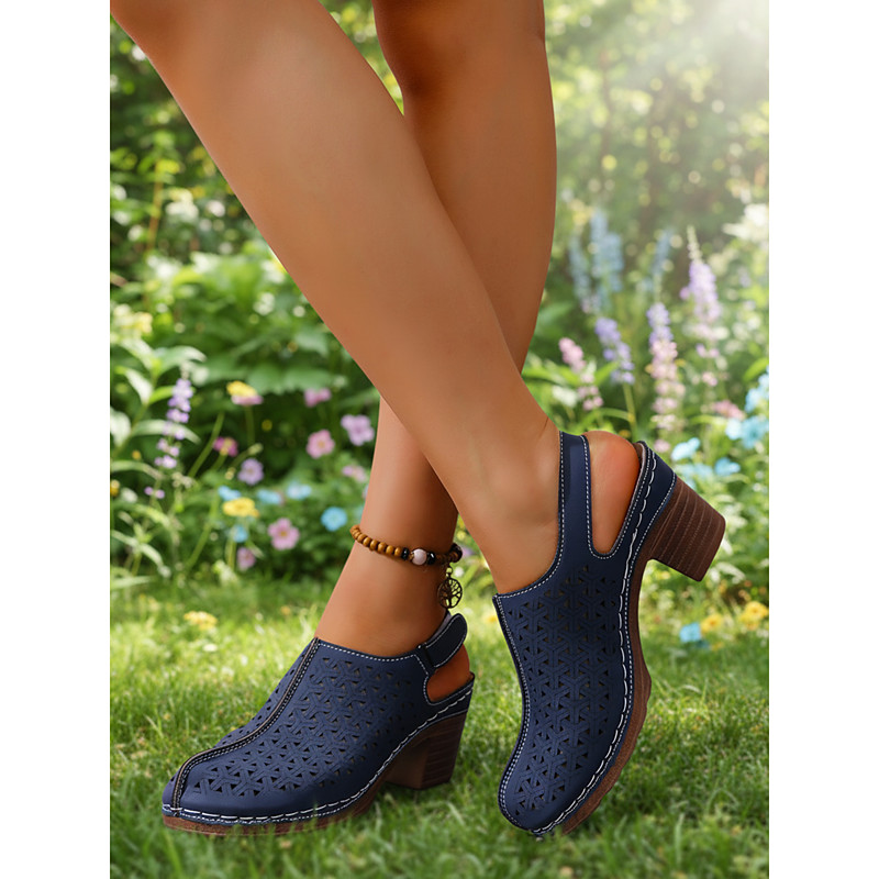 Women's Blue Perforated Slingback Pumps - Casual Comfort Shoes with Chunky Heel, Breathable Cutout Design for Daily Errands, Garden Outings, Brunch Office Casual