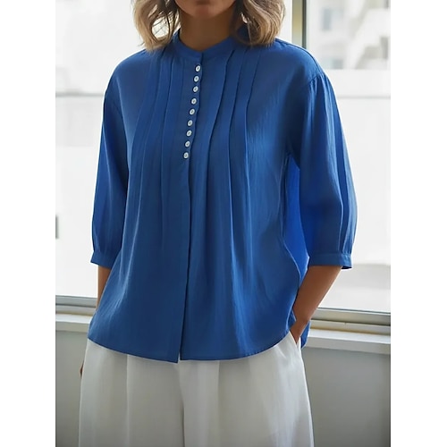 Per donna Camicia Camicia button-down Camicia casual Blusa Pieghettato Bottoni Tinta unica Semplice Elegante Classico Moderno Manica Lunga Collo alla coreana Top Regolari Quotidiano Ferie Uscire Blu