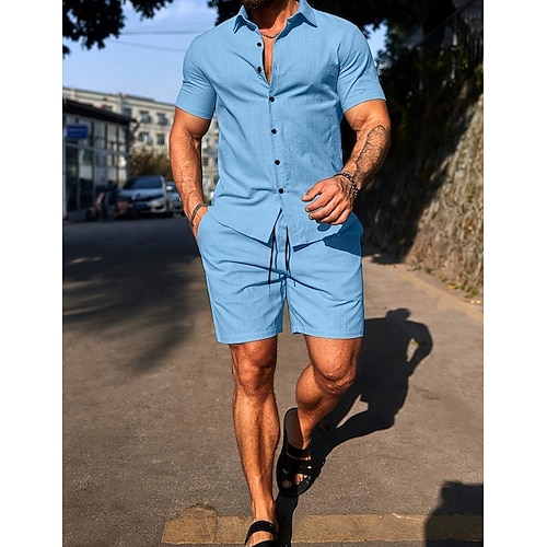 Herren Hemd Hemd Set Freizeithemd Knopfhemd Schwarz Rote Königliches Blau Himmelblau Grün Kurzarm Einfach Hemdkragen Lässig Täglich 2 teilig Bekleidung Elegant Mode Lässig