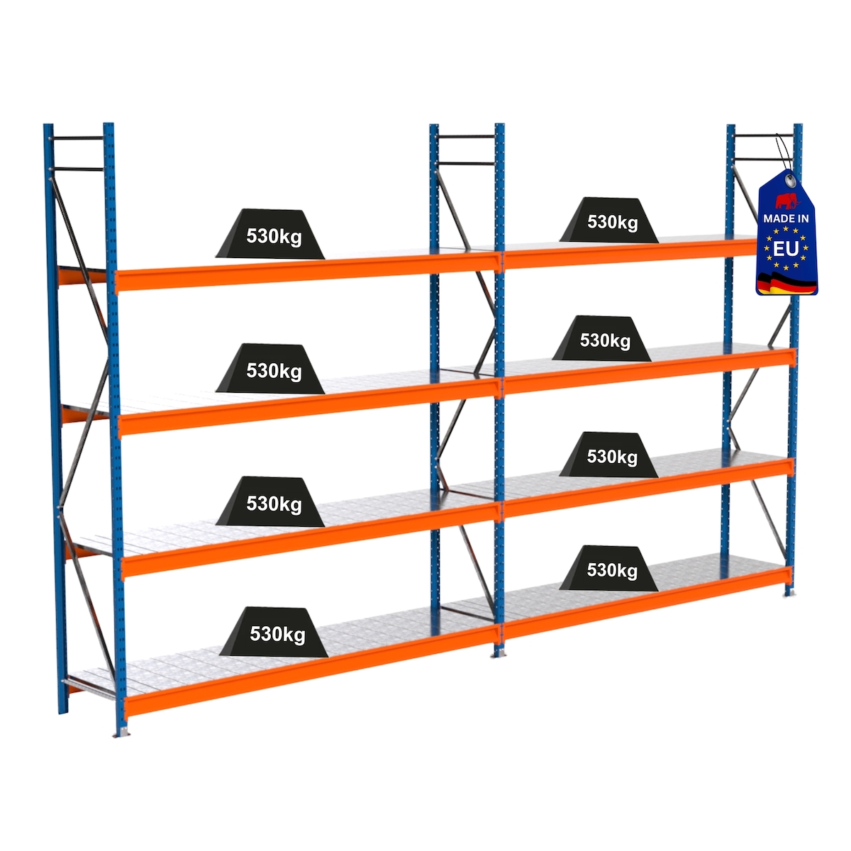 PROREGAL Industrie Schwerlastregal MAXIMUS PRO, Komplettregal, HxBxT 300x500x60cm, 4 Ebenen, Stahlplatten-Fachboden, Fachlast 530 kg, Blau/Orange