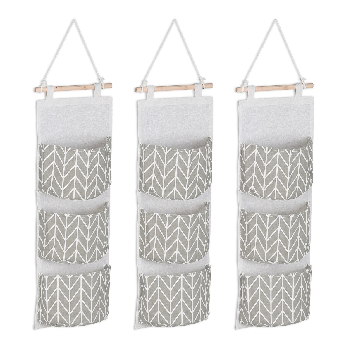Relaxdays Hängeorganizer, 3 Fächer, Baumwolle, HxB: 74x20 cm, Wandorganizer Bad, Flur, Büro, Hängeaufbewahrung, grau