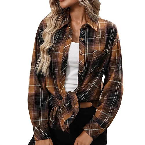 Per donna Camicia Blusa Plaid Semplice Elegante Vintage Quotidiano Manica Lunga Colletto a Camicia Top Regolari Quotidiano Lavoro Ferie Arricciato Patchwork Tasca Blu Giallo Marrone chiaro Arancione